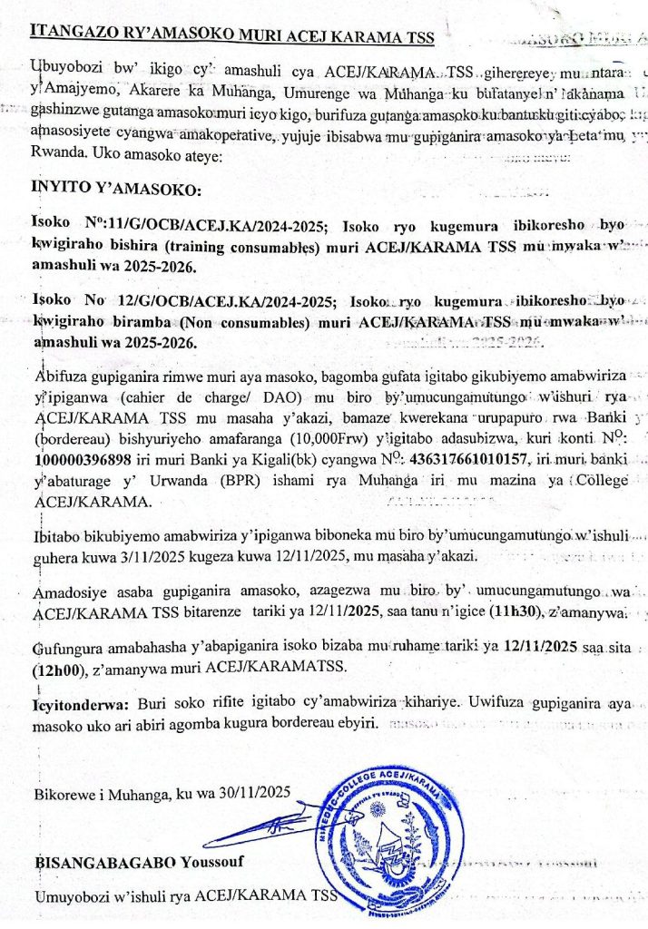 ACEJ/KARAMA/TSS: Isoko ryo kugemura ibikoresho byo kwigiraho bishira (training consumables) n’iry’ibikoresho biramba (non consumbales), mu mwaka w’amashuri wa 2025-2026 Ukwakira 31, 2025 Hashize amasaha 9 Imvaho Nshya Ukwakira 31, 2025 Hashize amasaha 9 Imvaho Nshya Ukwakira 31, 2025 Hashize amasaha 9