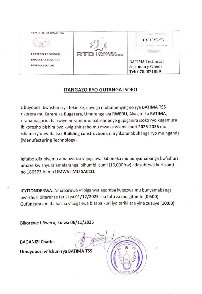 BATIMA TSS: Isoko ryo kugemura ibikoresho bishira byo kwigishirizaho mu ishami ry’ubwubatsi n’iry’ikoranabuhanga ryo mu nganda, mu mwaka w’amashuri 2025-2026 Ugushyingo 10, 2025 Hashize amasaha 3 Imvaho Nshya Ugushyingo 10, 2025 Hashize amasaha 3 Imvaho Nshya Ugushyingo 10, 2025 Hashize amasaha 3