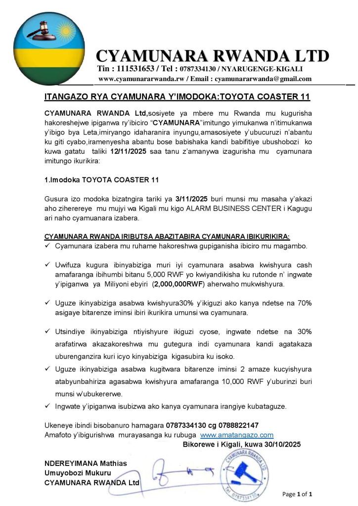 CYAMUNARA RWANDA Ltd: Itangazo rya cyamunara y’imodoka 11 zo mu bwoko bwa TOYOTA COASTER Ukwakira 31, 2025 Hashize amasaha 9 Imvaho Nshya Ukwakira 31, 2025 Hashize amasaha 9 Imvaho Nshya Ukwakira 31, 2025 Hashize amasaha 9
