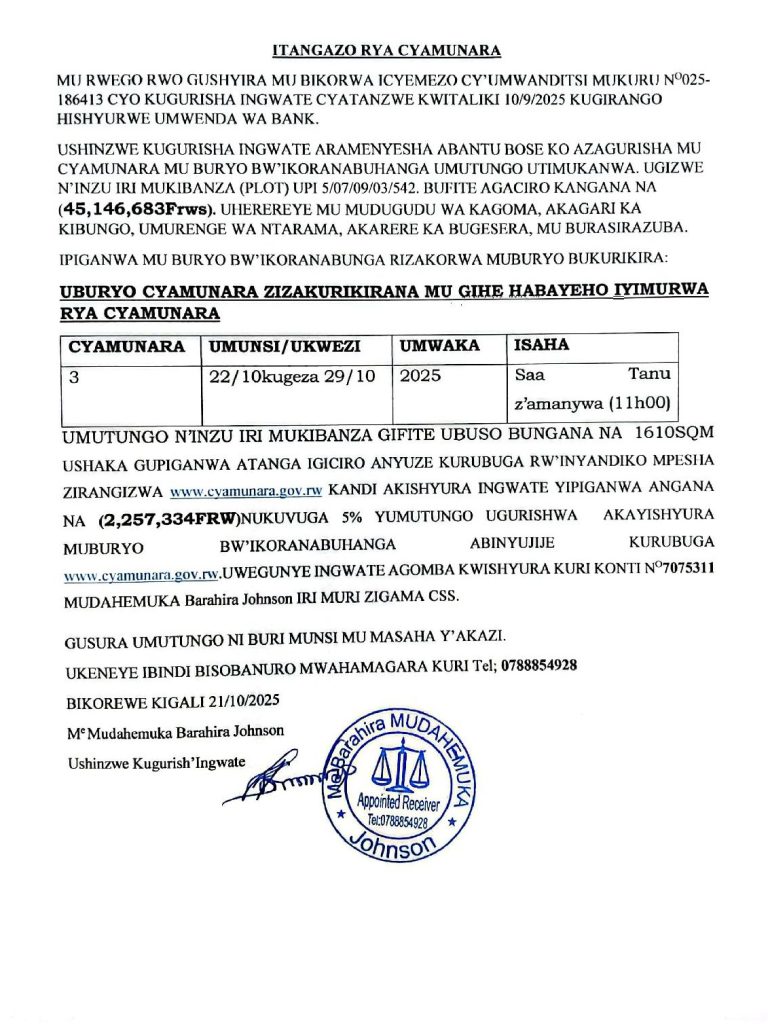 Cyamunara y’inzu iri mu kibanza gifite UPI 5/07/09/03/542 giherereye i Ntarama mu Karere ka Bugesera Ukwakira 21, 2025 Hashize amasaha 19 Imvaho Nshya Ukwakira 21, 2025 Hashize amasaha 19 Imvaho Nshya Ukwakira 21, 2025 Hashize amasaha 19