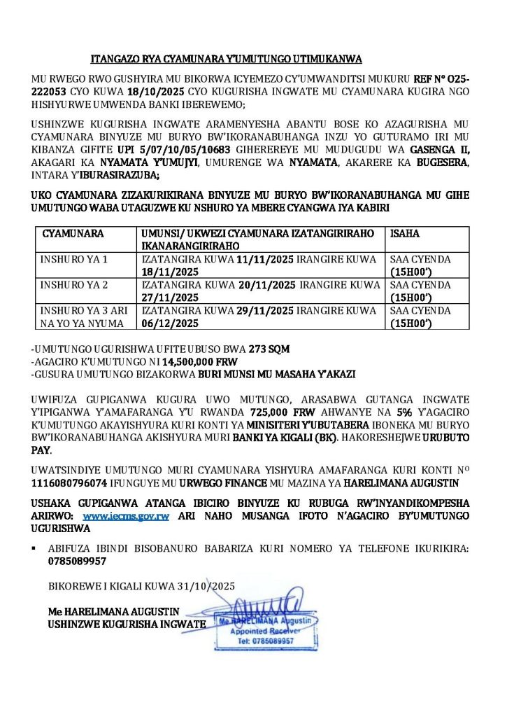 Cyamunara y’inzu yo guturamo iri mu kibanza gifite UPI 5/07/10/05/1063 giherereye i Nyamata mu Karere ka Bugesera Ukwakira 31, 2025 Hashize iminsi 3 Imvaho Nshya Ukwakira 31, 2025 Hashize iminsi 3 Imvaho Nshya Ukwakira 31, 2025 Hashize iminsi 3
