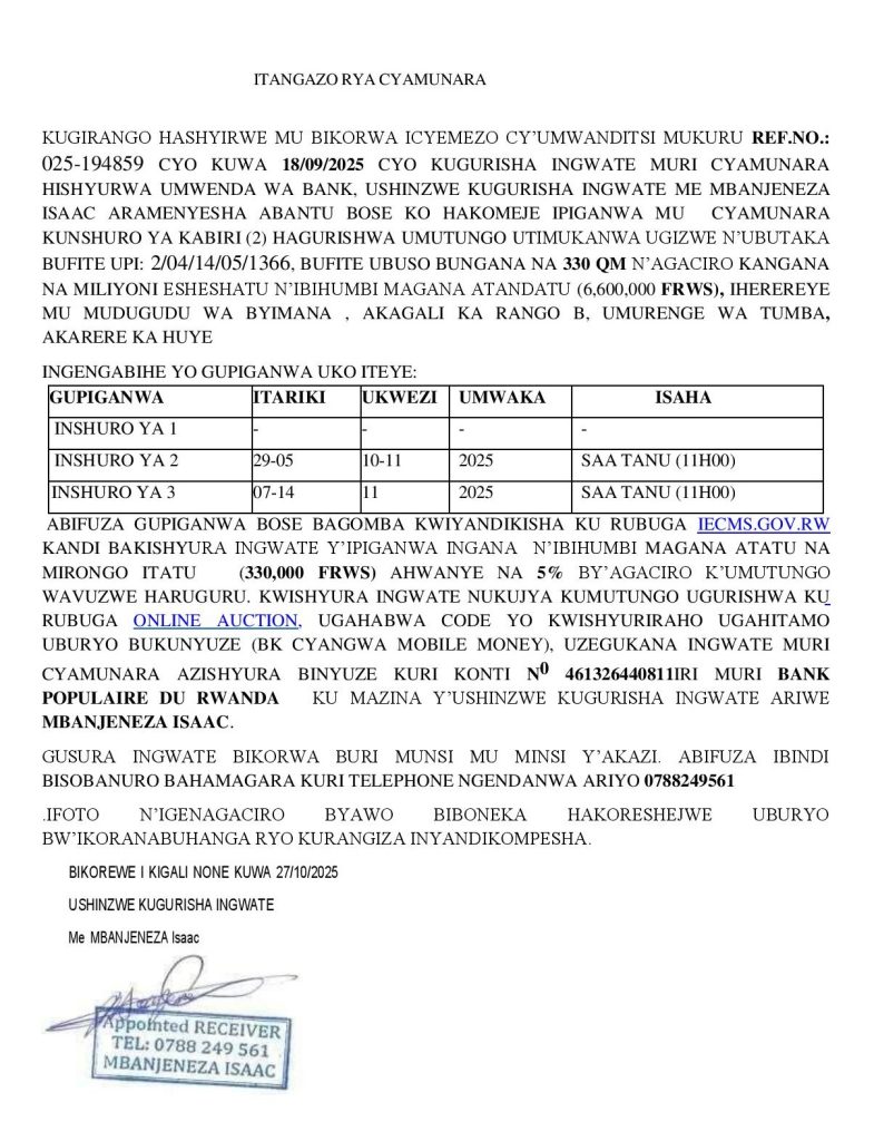 Cyamunara y’umutungo utimukanwa ugizwe n’ubutaka bufite UPI 2/04/14/05/1366 buherereye i Tumba mu Karere ka Huye Ukwakira 27, 2025 Hashize amasaha 3 Imvaho Nshya Ukwakira 27, 2025 Hashize amasaha 3 Imvaho Nshya Ukwakira 27, 2025 Hashize amasaha 3
