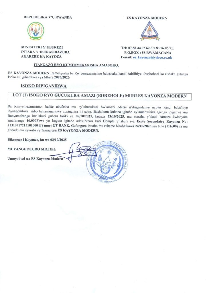 ES KAYONZA MODERN: Isoko ryo gucukura amazi (borehole) mu gihembwe cya mbere 2025-2026 Ukwakira 3, 2025 Hashize ukwezi 1 Imvaho Nshya Ukwakira 3, 2025 Hashize ukwezi 1 Imvaho Nshya Ukwakira 3, 2025 Hashize ukwezi 1