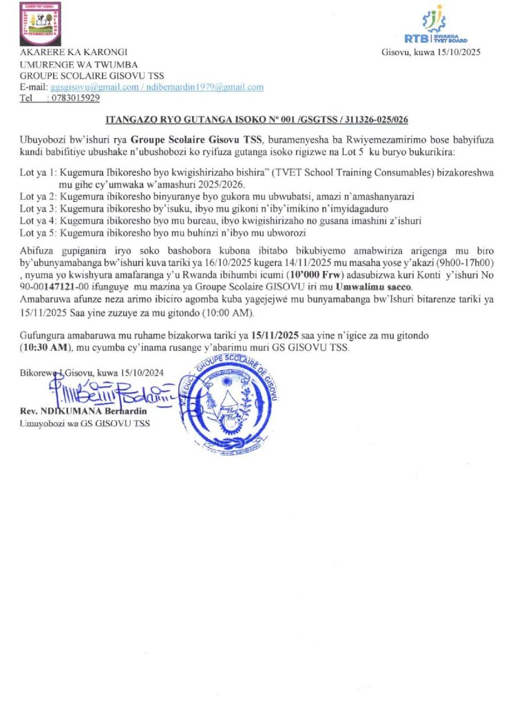 GS GISOVU TSS: Isoko ryo kugemura ibikoresho byo kwigishirizaho bishira, ibyo gukora mu bwubatsi, amazi n’amashanyarazi, iby’isuku, ibyo mu gikoni n’iby’imikino n’imyidagaduro, ibyo mu biro… Ukwakira 15, 2025 Hashize ibyumweru 2 Imvaho Nshya Ukwakira 15, 2025 Hashize ibyumweru 2 Imvaho Nshya Ukwakira 15, 2025 Hashize ibyumweru 2