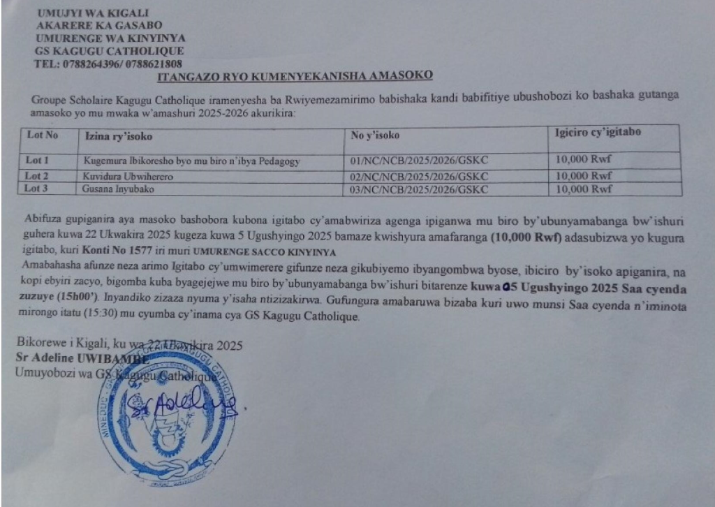 GS KAGUGU CATHOLIQUE: Isoko ryo kugemura ibikoresho byo mu biro n’ibya Pedagogy, iryo kuvidura ubwiherero n’iryo gusana inyubako Ukwakira 28, 2025 Hashize amasaha 7 Imvaho Nshya Ukwakira 28, 2025 Hashize amasaha 7 Imvaho Nshya Ukwakira 28, 2025 Hashize amasaha 7