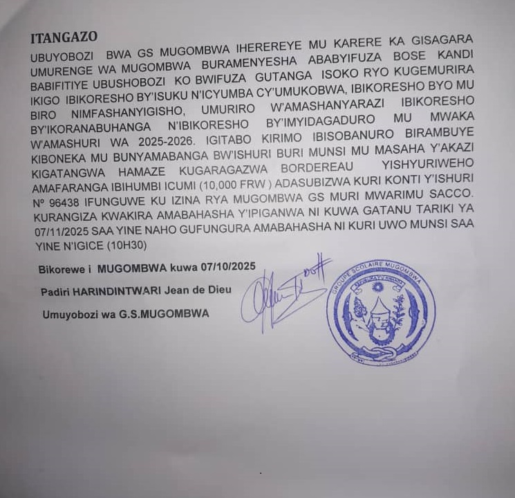 GS MUGOMBWA: Isoko ryo kugemura ibikoresho by’isuku n’icyumba cy’umukobwa, ibyo mu biro n’imfashanyigisho, iby’imyidagaduro, umuriro w’amashanyarazi mu mwaka w’amashuri wa 2025-2026 Ukwakira 7, 2025 Hashize ukwezi 1 Imvaho Nshya Ukwakira 7, 2025 Hashize ukwezi 1 Imvaho Nshya Ukwakira 7, 2025 Hashize ukwezi 1