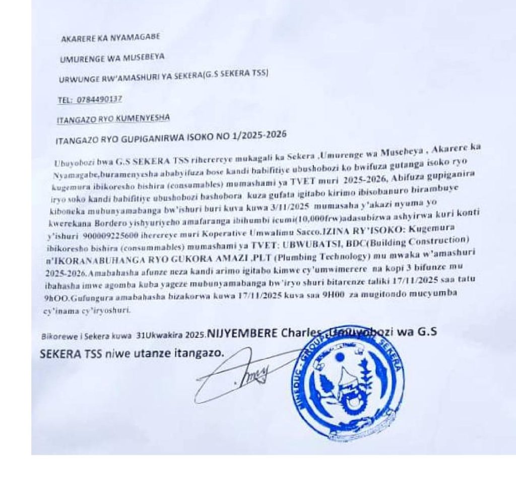 GS SEKERA TSS: Isoko ryo kugemura ibikoresho bishira mu mashami ya TVET muri 2025-2026 Ugushyingo 1, 2025 Hashize amasaha 8 Imvaho Nshya Ugushyingo 1, 2025 Hashize amasaha 8 Imvaho Nshya Ugushyingo 1, 2025 Hashize amasaha 8