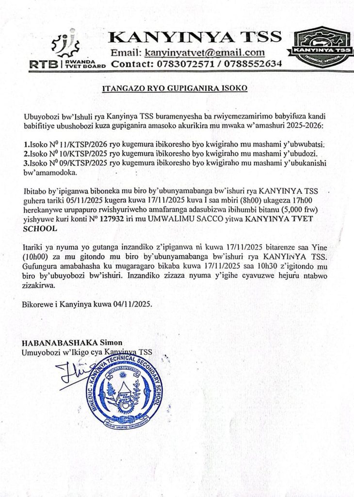KANYINYA TSS: Isoko ryo kugemura ibikoresho byo kwigishirizaho mu ishami ry’ubwubatsi, iry’ubudozi n’iry’ubukanishi bw’imodoka, mu mwaka w’amashuri 2025-2026 Ugushyingo 4, 2025 Hashize amasaha 4 Imvaho Nshya Ugushyingo 4, 2025 Hashize amasaha 4 Imvaho Nshya Ugushyingo 4, 2025 Hashize amasaha 4