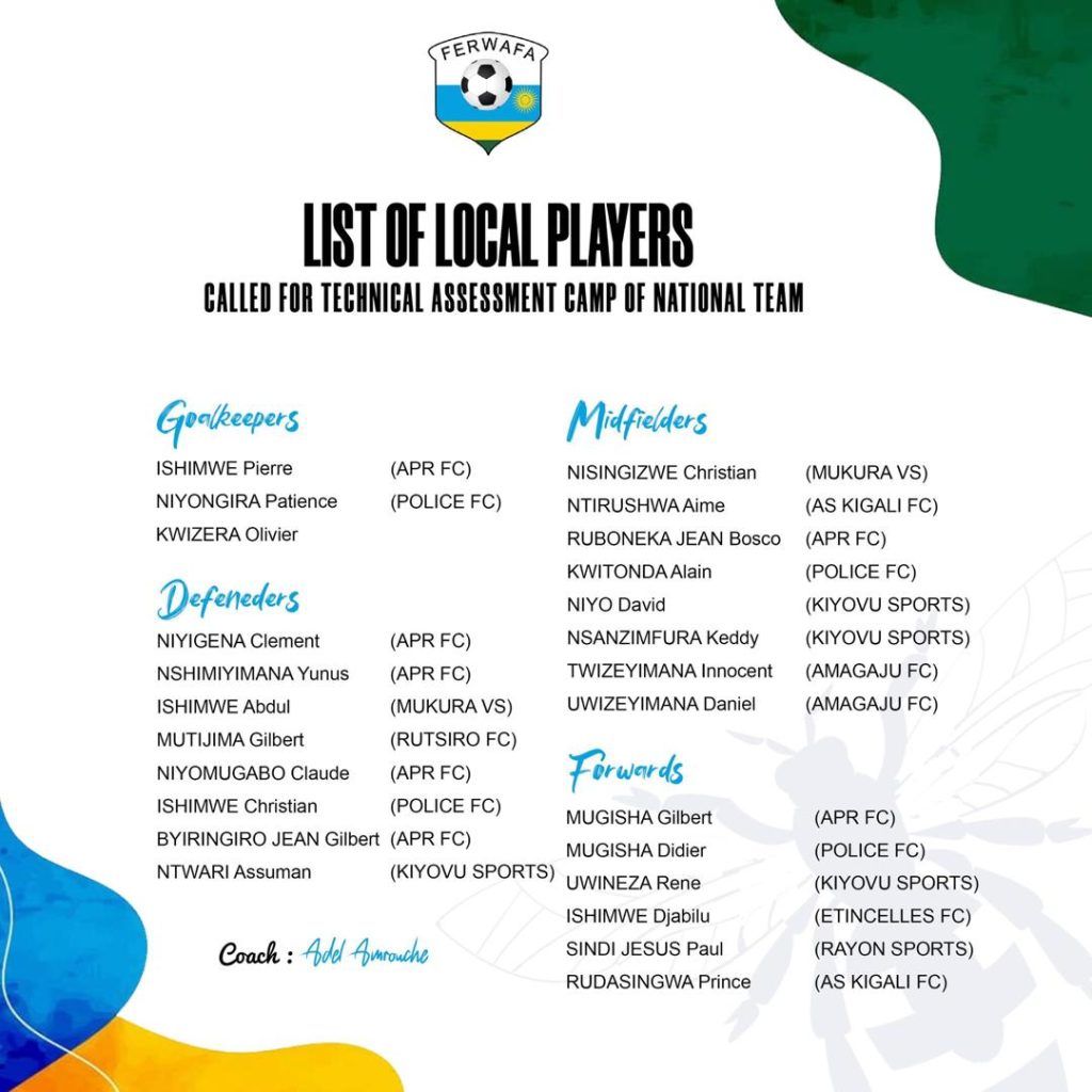 Umutoza w’Ikipe y’Igihugu y’u Rwanda “Amavubi”, Adel Amrouche, yahamagaye abakinnyi bakina imbere mu gihugu bazitabira umwiherero uteganyijwe muri iki cyumweru barimo umunyezamu Kwizera Olivier wari umaze hafi imyaka ine adahamagarwa.
