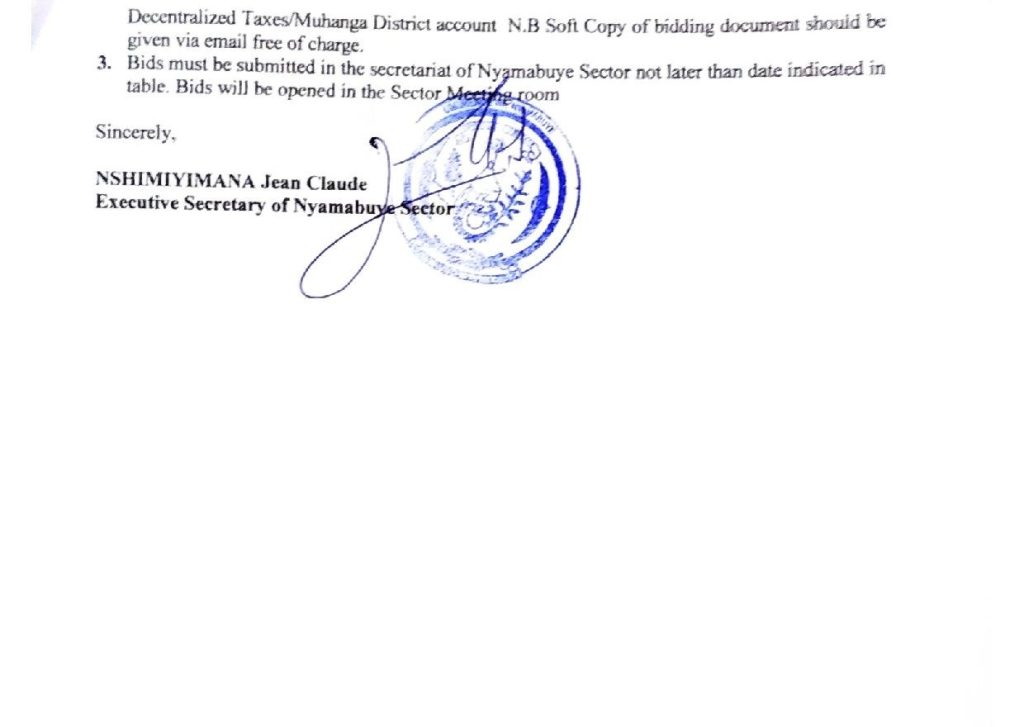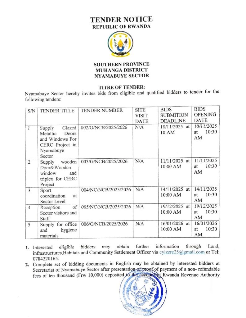NYAMABUYE SECTOR: Tender for Supply Glazed Metallic doors and windows, wooden door & window for CERC Project, sport coordination and supply of office and hygiene materials Ukwakira 31, 2025 Hashize amasaha 7 Imvaho Nshya Ukwakira 31, 2025 Hashize amasaha 7 Imvaho Nshya Ukwakira 31, 2025 Hashize amasaha 7
