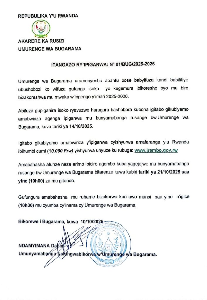 UMURENGE WA BUGARAMA: Isoko ryo kugemura ibikoresho byo mu biro bizakoreshwa mu mwaka w’ingengo y’imari 2025-2026