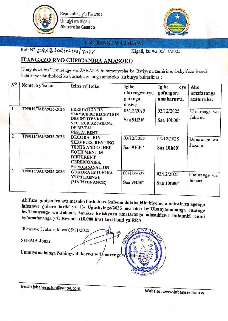 UMURENGE WA JABANA: Itangazo ryo gupiganira amasoko Ugushyingo 6, 2025 Hashize amasaha 2 Imvaho Nshya Ugushyingo 6, 2025 Hashize amasaha 2 Imvaho Nshya Ugushyingo 6, 2025 Hashize amasaha 2