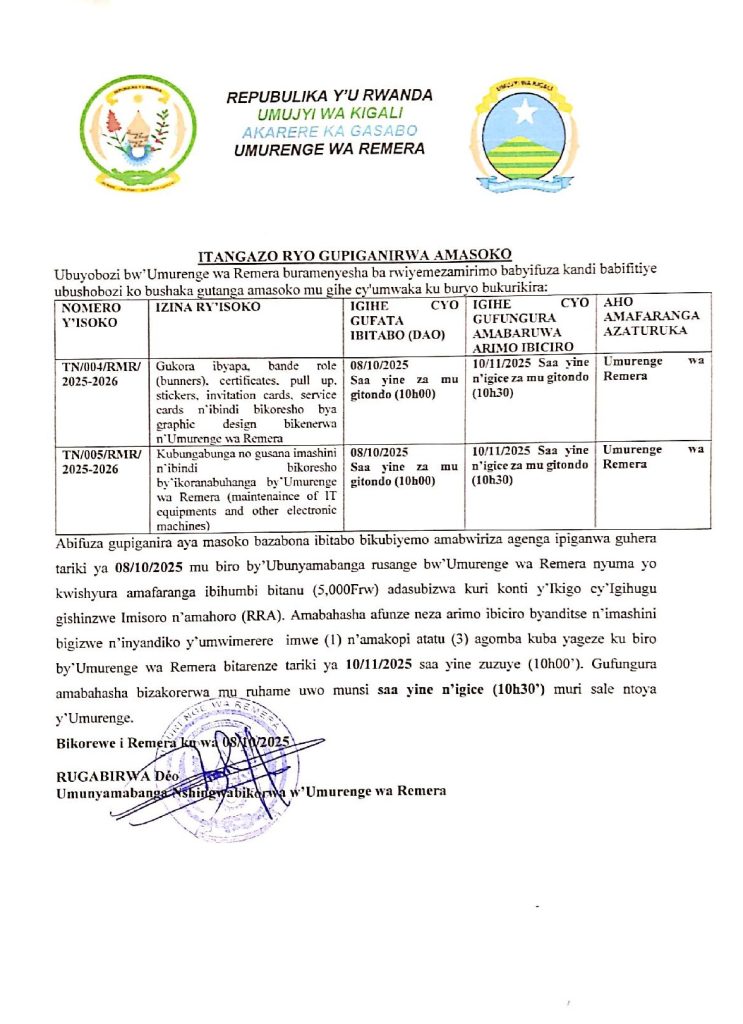 UMURENGE WA REMERA: Isoko ryo gukora ibyapa, bande role (banners), certificates, pull up, stickers, invitation cards, service cards, ibikoresho bya graphic design, n’iryo kubungabunga no gusana imashini n’ibindi bikoresho by’ikoranabuhanga